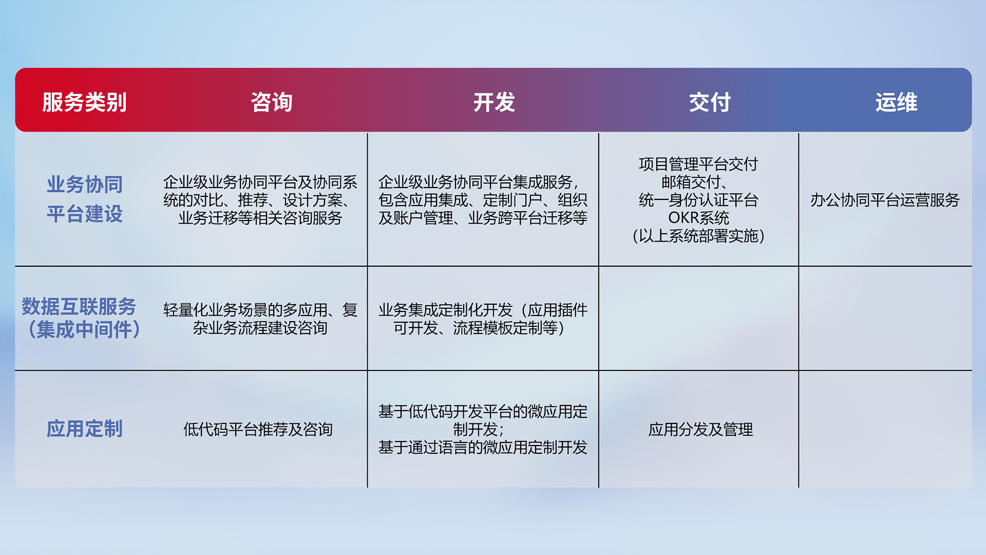 针对钉钉、、、、企微、、、IDaas等平台级产品提供产品的规划、、、、方案、、、、交付、、、、定制化开发等服务,,,实现如统一协同办公、、、智能客户服务、、、混合会议管理、、、、智能数据查询、、、等业务场景,,实现数字化转型。。